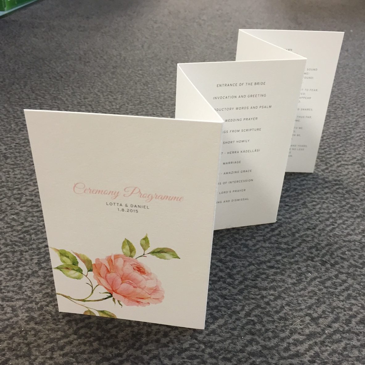 Muista liittää tarjouspyyntöösi toivomasi koko. Hääohjelmillamme ei ole muuta kokorajoitusta, kuin että se mahtuu kokonaisuudessaan A3-kokoiselle arkille.
