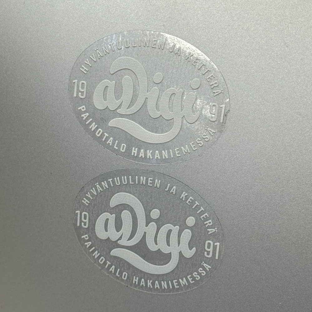Läpinäkyvät tarrat saat haluamassasi koossa. Verkkokauppaamme on merkitty jonkin verran yleisimpiä kokoja ja mikäli et löydä sieltä tarvitsemaasi, pyydä erillistä tarjousta yhteydenottolomakkeemme kautta tai sähköpostitse adigi@adigi.fi.